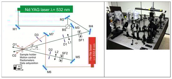 Diffraction gratings are recorded in the HPDLC/adulterated peppermint oil composite samples using the holographic setup shown in Figure 1. A Nd:YAG continuous laser with a wavelength of 532 nm was utilized to record volume diffraction gratings. The laser beam was split into a reference beam and object beam with the same irradiance of 1 mW/cm2. The diameter of these beams was expanded to 10 mm using lenses, and spatial filters with pinholes were used to improve the quality and homogeneity of the beams. The object and reference beams were recombined at the sample at an angle of 16.0 degrees to the normal using mirrors. The spatial frequency obtained in the interference of the two beams was 1036 lines/mm. The diffracted and transmitted intensity were monitored in real-time with a He-Ne laser (632.8 nm) positioned at Bragg’s angle (19.1°). The ambient temperature in which recordings were made was 23 °C.