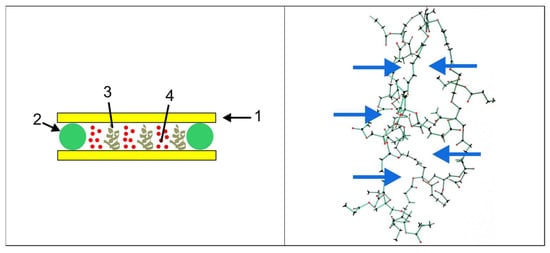 (Left) sample structure, 1: glass substrate, 2: microspacers, 3: exposed zones with polymer network, 4: unexposed zones with liquid crystal droplets. (Right) 3D polymer network from DPHPA. Arrows show holes in the network with a similar or higher size than an LC molecule.