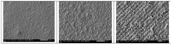 Figure 7 shows high-resolution SEM images for a sample with peppermint oil (purity 50%) and with a cross-sectional viewpoint for the center and right images. The SEM technique allows visualizing the structure of the diffraction network generated.