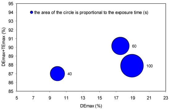 DEmax + TEmax versus DEmax for different exposure times during the hologram recording.