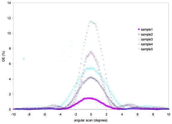 DEmax of each curve in Figure 3 is related to the product n1(t)max d with the other factors approximately constant. On the other hand, the width of the angular response curves is related to d that is similar for all samples (sample 3 has a somewhat larger curve width, which affects the value of d). Therefore, DEmax is directly related to the index modulation obtained for the photopolymer [,].
