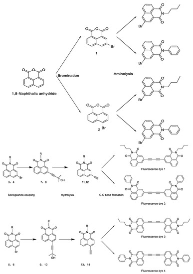 - Kyung, W.K.; Geun, H.K.; Su, H.K.; Hyo, I.Y.; Jung, E.S.; Jae, H.C. Synthesis and photophysical properties of blue-emitting fluorescence dyes derived from naphthalimide derivatives containing a diacetylene linkage group. Dyes Pigments 2018, 158, 353–361. [Google Scholar]