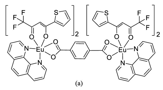 - Zhao, X.H.; Huang, K.L.; Jiao, F.P.; Yang, Y.; Li, Z.; Liu, Z.; Hu, S. Syntheses and applications of Eu(III) complexes of 2-thienyltrifluoroacetonate, terephthalic acid and phenanthroline as light conversion agents. J. Cent. South Univ. Technol. 2007, 14, 62–67. [Google Scholar] [CrossRef]