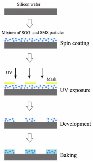 - Liu, X.; Zhang, X.X.; Zhou, Z.F. Preparation and luminescence properties of patterned SOG/ Sr2MgSi2O7:Eu2+, Dy3+ long-persistent luminescence composite thin films by one-step photolithography. Mater. Res. Bull. 2016, 79, 84–89. [Google Scholar] [CrossRef]