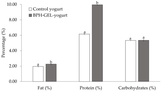 The bromatological composition of the BPH-GEL-yogurt and the control yogurt are shown in Figure 1. The fat content was significantly higher in the BPH-Gel-yogurt than in the control yogurt (2.27 ± 0.02 vs. 1.97% ± 0.06 respectively; p < 0.05). This behavior was due to the addition of the BPH in the gel to retain more fat. The fat content in both products was lower compared with other studies that report a fat content above 6.4% (Costa et al. [56]) and 7.0% (Pinto et al. [57]) in natural Greek-style yogurt. Fat content is an important indicator of sensory attributes that impact the characteristics of this type of yogurt, such as consistency and the creaminess sensation [35,58,59].