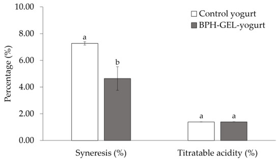 Significant differences (p < 0.05) were observed among the two yogurts in terms of syneresis (Figure 2). Syneresis was two-fold higher in the control yogurt (7.27% ± 0.13) than the BPH-GEL-yogurt (4.64% ± 0.88). This behavior was attributed to the BPH-GEL incorporation. The increase of proteins in the gel, attributable to WPC and BPH, played an essential role in the water-holding capacity, providing stability to the formed network [33,41].
