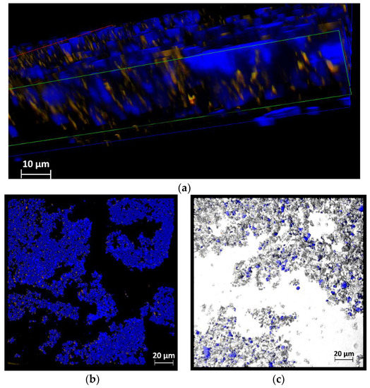 The morphological characterization of the BPH-GEL and BPH-GEL-yogurt was performed by confocal microscopy. The identification of the BPH distributed in the gel is shown in Figure 4a,b. Figure 4a shows a cross-section of a fragment of the BPH-GEL, where the BPH (yellow color) is observed immersed in a W-GEL (blue color). The aggregates formed from the BPH-GEL are shown in Figure 4b. The microstructure of the gels was analyzed by confocal microscopy. This technique is used because it has a higher sharpness to stain the biopolymers and thus identify the spatial array structures of the biopolymers [67]. The presence of hemispherical particles (color blue) of sizes around 2–4 µm (Figure 4a) was observed. Furthermore, aggregated particles of different sizes (Figure 4b) were observed in the Greek-style yogurt (gray color), having aggregates smaller than 20 µm (Figure 4c), allowing a more homogeneous distribution in the product. This indicates that the encapsulation system guarantees the protection of these bioactive compounds when incorporated into food. Geremias-Andrade et al. [68] developed and characterized polysaccharide and protein gels with curcumin using confocal microscopy. Moreover, whey protein complexes and gum arabic were observed using confocal microscopy to evaluate the morphology and stability of the oil droplets [69].