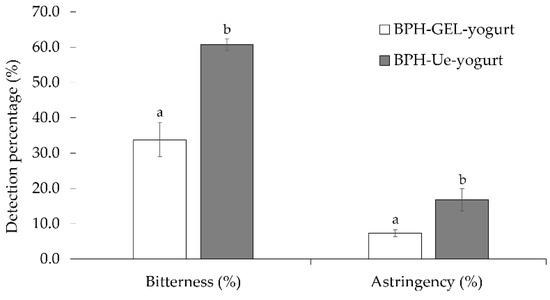 Bitterness and astringency of BPH-GEL-yogurt and BPH-Ue-yogurt. BPH-GEL-yogurt: Greek-style yogurt with BPH encapsulated in a gel; BPH-Ue-yogurt: Greek-style yogurt with unencapsulated BPH. Lowercase letters mean significantly different by the descriptor. (p < 0.05).