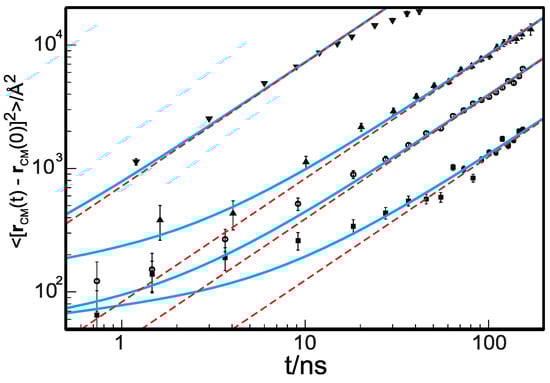 Thus, the dynamics of a given chain is coupled through a time-dependent potential of mean force to the motion of its surrounding matrix in the timescale . This observation explains the inability of the mean-field Rouse equation to correctly predict the dynamics in the timescale shorter than the time necessary for the coupling potential to decay to zero. Therefore, the following natural step is the derivation from the Liouville equation of the dynamics of a group of interacting chains, where the motion is coupled by the time-dependent potential of mean force just observed. If one follows these steps and solves the Langevin equation for a group of interacting polymers, one can derive a set of coupled Rouse-like equations that predict anomalous dynamics [29,30,31]. In this model, which we called the cooperative dynamics generalized Langevin equation (CD-GLE), there is one free parameter, , which is optimized by direct comparison with data of c.o.m. mean-squared displacement. When the theory is compared with data of mean-squared displacement from simulations or from experiments, one finds that the optimal number of correlated chains obeys the predicted scaling of , which is in agreement with the simple analysis just presented. For example, for the data in Figure 1, one finds that for , , , and [41].