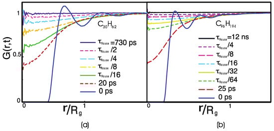 In Figure 3, the monomer van Hove distribution function shows two different characteristic times of relaxation. The first defines the time necessary for the fluid to lose the memory of its initial configuration on the local scale, corresponding to an intermolecular distance , and to a short relaxation, ~20 ps, which is needed for the loss of the fine monomeric structure. This process is identical for C30H62 and for C96H194, and it is molecular weight-independent. In fact, on the local scale, the monomer dynamics depend on the chain stiffness and the local monomer density. Still, it is independent of the polymer length unless the chain’s length is short and comparable to the persistence length. The monomer relaxation, however, is sensitive to the specific chemical structure of the monomer, i.e., the local conformational energy barriers. Its timescale depends on the chemical structure of the monomer [15,47]. On the global scale of , i.e., of the correlation hole, the van Hove function decays on a timescale comparable to . Thus, this second timescale is dependent. The decay is bounded by an intermolecular distance of the order of the correlation hole, .