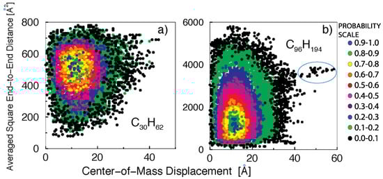 In the C30H62 sample (Figure 4a), the mean-squared end-to-end distance is , while a fully extended chain would have . The persistent stretched configurations, , correspond to of chain stretching. For the C96H194 (Figure 4b), where , the stretched configurations with correspond to of chain stretching.