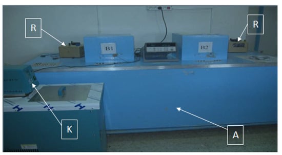 To measure the thermal conductivity, we used the device shown in Figure 3. It consisted of an isothermal enclosure (A) kept at a temperature lower than the two cans (B1 and B2) using a heat exchanger fed by a cryostat (K). The enclosure (A) constituted the cold source of the system. The heat source was provided by two heating plates, each located in a box fed by a rheostat (R) and containing the samples to be tested. A uniform temperature was imposed in the box through electrical voltage applied to the terminals of the plate. A console indicated the value of this voltage, and an ohmmeter made it possible to measure the resistances of each box. The amount of heat dissipated by the system was then evaluated. Platinum thermostats were used to detect temperatures on the upper and lower surfaces of the sample, and two sensors measured the ambient temperature in the box and the temperature in the room. The thermal gradient imposed between the box (B) and the isothermal enclosure (A) created a heat flow between the upper and lower surfaces of the sample.