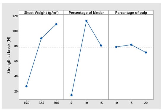 The same phenomenon was observed when a high ratio of pulp was used. The pulp was formed by a small fiber with a low diameter and length. A high percentage of pulp affected the average pore size and diameter of the structure and had a negative effect on the permeability. It is interesting to remark that there was a positive interaction between the sheet weight and the ratio of the pulp. The effect of the percentage of the pulp on the permeability was different for a high web weight than for a low sheet weight. For a high web weight (thick nonwoven), the permeability of the structure depended more on the pore sizes and shapes. For a low sheet weight (thin nonwoven), the average fiber diameter (decreased by the addition of a high percentage of pulp) would affect the permeability of the structure more. Figure 4, Figure 5 and Figure 6 demonstrate that the mechanical properties of the nonwoven depended on the weight of the sheet and the binder ratio. In contrast to the woven and knitted structure formed by yarns with good mechanical properties, the nonwovens were composed of a fiber structure. The wet-laid nonwoven’s mechanical properties are given by inter-fiber friction and the binder percentage and properties. The more the quantity of fibers and binders increased (sheet weight increased), the more the strength increased. The effect of inter-fiber friction was more important for thick webs than for thin webs, contrary to the effect of the binder ratio. For thin webs, the binders influenced the resistance of the nonwoven mor than the inter-fiber friction. This explains the influence of the interaction between the web thicknesses and the ratio of the fiber to binder (Table 5).