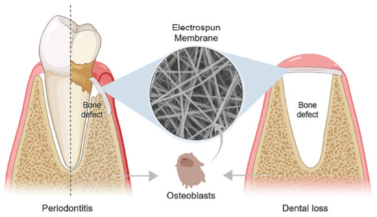 The application of an electrospun membrane for guided tissue/bone regeneration (GTR/GBR) in periodontitis and dental loss, respectively. Reprinted from Ref. [10].