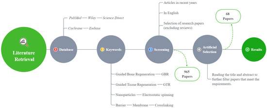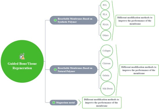 Although both absorbable and nonabsorbable membranes are superior to internal applications, GTR/GBR membranes still require a considerable amount of research for the development of ideal materials. Modern research of GTR/GBR membranes considers structural (e.g., cell compatibility and degradability) as well as functional properties, such as the incorporation of growth factors and antibiotics with chemically controlled release times [11,18,19]. Although most of the research has occurred in vitro, the collective findings of these studies reflect the immense potential for clinical application. The continuous clinical development of GTR/GBR membranes necessitates a comprehensive review of promising membrane modifications. In a review of related literature on PubMed, Wiley, Cochrane, Embase, and ScienceDirect, we found very few resources related to modified nonabsorbable membranes over the past five years. Due to the practical limitations of nonabsorbable membranes, most modern studies focus on absorbable membranes. Based on this, the present review was focused on the improvements made in absorbable membrane technology during the last five years.