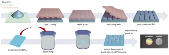 The preparation of equine bone powder (EBP)-coated polycaprolactone (PCL) nano-patterned patches, reprinted from Ref. [43].