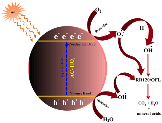 To further understand the photocatalytic mechanism of the as-prepared photocatalysts, the degradation mechanism of RR 120 and OFL by AC-TiO2 under UV-A light is shown in Scheme 2. When the TiO2 is irradiated with UV-A light, a valance electron goes to the conduction band (CB) and leaves a hole in the valence band (VB). The heteroatom-rich biomass-derived AC-TiO2 acts as an adsorbent and an electron mediator and suppresses the electron-hole recombination. The photo-excited electrons (CB) reacted with dissolved oxygen, producing superoxide radical anions (O2●−). In the meantime, hydroxyl radicals (●OH) were formed because of the reaction between holes (VB) and water, and both species were effective towards photocatalytic degrading of RR 120 and OFL. The scavenger experiment was performed in RR 120 degradation with AC-TiO2 under UV-A light to find the most active species involved in the photodegradation process of RR 120 and OFL (Figure 13b). The addition of 0.1 mmol of tertiary butyl alcohol (TBA, scavenger of ●OH), potassium iodide (KI, scavenger of h+), benzoquinone (BQ, scavenger of O2●−), and silver nitrate (AgNO3, scavenger of e−) contributed a significant decrease in the photodegradation efficiency of the catalyst. The degradation efficiency of the catalyst was dramatically reduced by the addition of silver nitrate, leading to the conclusion that electrons (e−) constitute the primary active species in the degradation.