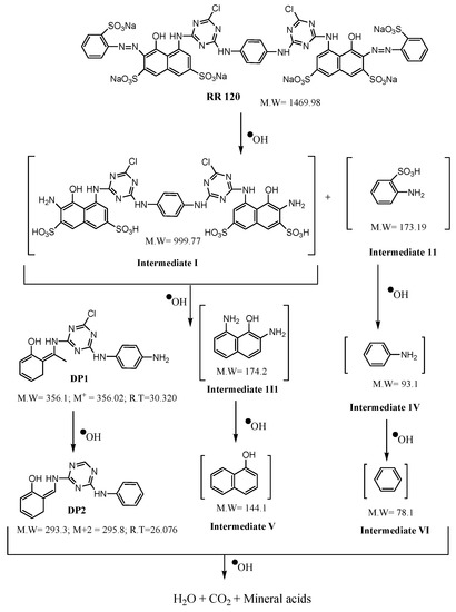 The photocatalytic degradation pathway of RR 120 has been proposed based on GC-MS analysis (Scheme 3). During the different irradiation times, the solution was subjected to GC-MS analysis. The results were analyzed based on the molecular ion peak and fragmentation pattern, and a suitable degradation pathway was proposed. There were two degradation intermediates (DP 1 & DP 2) identified, and the details are given in Table 1. Since the degradation experiment was conducted in a slightly acidic condition (pH =5), the sulfonic acid group-containing intermediates (I and II) were expected to form via azo bond cleavage. The intermediate compound I underwent further C-N cleavage, and partial naphthyl ring-opening produced desulphonated product (6Z)-6-(1-(4-(4-aminophenylamino)-6-chloro-1,3,5-triazine-2-ylamino)ethylidene)cyclohexa-1,3-dienol (DP I), and naphthalene derivative (intermediate III). The intermediate compound III underwent desulfonation and produced aniline (intermediate IV). The identified degradation product DP1 further underwent dichlorination, deamination followed demethylation produced another identified degradation product (6Z)-6-((4-(phenylamino)-1,3,5-triazine-2-ylamino)methylene)cyclohexa-1,3-dienol (DP 2). The naphthalene intermediate III underwent deamination produced naphthalene-1-ol (intermediate V), at the same time aniline (IV) underwent deamination and produced benzene (intermediate VI). It was expected that upon continuous attack of hydroxyl radicals, the compounds DP2, V, and VI would undergo further degradation and be mineralized to CO2, water, and mineral acids via this advanced oxidation process (AOPs).