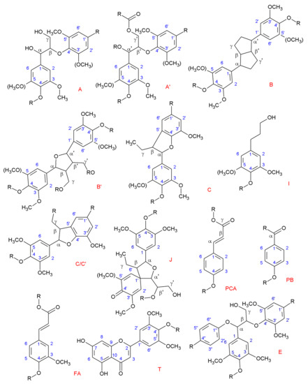 Main lignin structures identified by NMR. (R may indicate both aliphatic and aromatic chains.) (A) β-O-4 alkyl-aryl ethers; (A’) β-O-4 alkyl-aryl ethers with acylated γ’-OH with p-coumaric acid; (B) resinols; (B’) di-c-acylated mono-tetrahydrofuran structure formed by β–β’ coupling and subsequent a-O-a’ bonding (R, acetyl/p-coumaroyl); (C) phenylcoumarans; (I) p-hydroxycinnamyl alcohol end-groups; (C/C’) γ-acetylated phenylcoumaran (R, acetyl) (J) spirodienones (β-1′); (PCA) p-coumarates; (PB) p-hydroxybenzoate; (FA) ferulates; (T) tricin incorporation into the lignin polymer through a G-type β-O-4 linkage; (E) α,β-diaryl ethers (α-O-4/β-O-4).