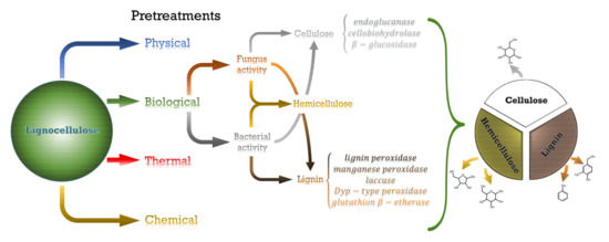 Lignocellulosic biomass has naturally developed protection against enzymatic and pathogen activity through a great entangled network in which the three biopolymers are covalent- or hydrogen-bonded, conforming to a great resilient structure [36], which now plays against technological needs when the disruption of the plant cell wall is aimed at [37]. In order to ease the proper separation among the different lignocellulosic biopolymers, a wide range of pretreatments is available [38]. Furthermore, when specific purposes that require determined properties are aimed at, the application of pretreatments of a different nature becomes necessary. These pretreatments have been classified into four categories: physical, thermal, chemical and biological pretreatments [37,39]. Nevertheless, within a determined process, changes in parameter conditions may anyway lead to diverse structural changes [40]. A descriptive scheme summarizing the main content of this section has been included as Scheme 1.