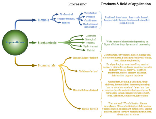 As previously mentioned, the great availability of a wide range of biopolymers and renewable characteristics has propelled the research into biofuels, biochemicals and biomaterials based on lignocellulosic components [70]. As an overview of this section, the different procedures, products and fields of application of lignocellulose-based biofuels, biochemicals and biomaterials are outlined in Scheme 2.