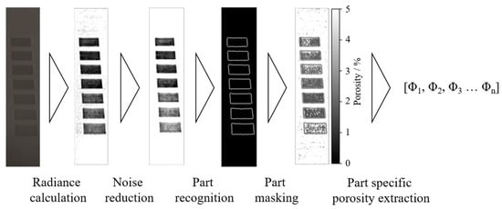 Image post-processing of raw data, displayed in Figure 1, compromises calculating the radiance of each pixel relative to an unexposed area within the powder bed to compensate for temporal variations in the illumination of the powder bed surface. Based on the two-dimensional porosity matrix, obtained from the neural network, the proposed approach allows for the process-integrated, spatially resolved identification of defects. A subsequent identification of part-specific cross-sections allows for the inline determination of part properties, schematically illustrated in Figure 2.