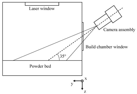 To obtain a homogenous illumination, two black body radiators (T = 4000 K) installed inside the build chamber are used. The applied setup, consisting of a camera assembly and the monitored powder bed, is displayed schematically in Figure 3.