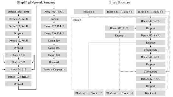 The residual artificial neural network, applied for the regression, is characterized by a segmented structure. This structure compromises an entry flow, a repetitive block structure and an exit flow. The entry flow receives 100 scalar values as input values, representing the normalized change of the radiance of a particular cross-section within the powder bed surface over time. After being processed by the residual block structure, a converging exit flow leads to the output of a single porosity value, corresponding to the porosity of the particular cross-section within the monitored layer. To increase the generalization capabilities of the neural network compared to a shallow network, a number of 24 consecutive blocks is applied. The resulting neural network compromises 131 fully connected layers, subsequently referred to as “Dense layers”, displayed in Figure 5. In addition to fully connected layers, the implementation of dropout layers [53] within the network further contributes to the generalization of the underlying dataset. To enhance the inherent feature extraction, the block structure compromises a complex information flow characterized by the implementation of three distinct information flows, shown in Figure 5. Each block structure receives information from up to six preceding blocks, thus significantly increasing the number of residual connections within the network. Given the fixed input of the applied network, compromising 100 consecutive time steps, the layer time is limited to a period of 100 s. Based on a predominant occurrence of layer times within a range of 20 s to 40 s, datasets with a duration below 100 s are synthetically enlarged by adding virtual time steps before the beginning of the layer. These virtual time steps correspond to the value of the first measured time step of the particular cross-section within a specific layer, indicating no change in optical properties before the beginning of the monitoring. Therefore, a vector of 100 float values, corresponding to the temporal change of the relative radiance of a particular cross-section, is applied as the input format.