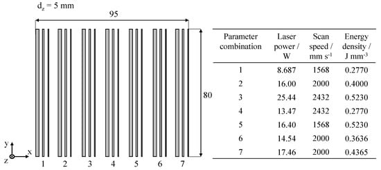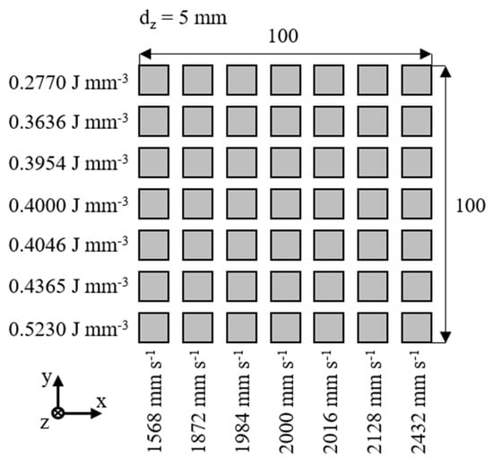 Based on the energy density variation, the corresponding laser power is determined for each factor combination based on the scan speed, the underlying specified energy density and constant boundary conditions. The validation layout compromises a 72 full factorial design of experiment, displayed in Figure 6. Therefore, 49 distinct parameter combinations are applied to validate the generalization capabilities of the trained neural network.