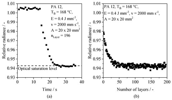 (a) Time-resolved evolution of detected part-specific relative radiance; (b) Influence of the number of consecutive layers on the emerging saturation level.