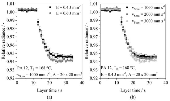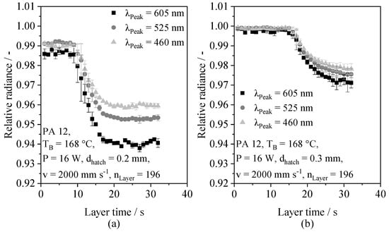 An increased energy input, displayed in Figure 10a, is correlated with a reduced measured radiance of long-wave radiation compared to short-wave radiation, thus implying a positive correlation of the wavelength and the monitored relative decay. In contrast, merely insignificant influences of the monitored spectrum can be observed for the application of an insufficient energy density level, shown in Figure 10b. With regard to the wavelength-dependent analytic modeling of light scattering in semi-crystalline polymers by Molnár et al. (2020) [57], the observed wavelength dependencies can be correlated with the occurrence of Mie scattering inside the melt pool. Therefore, wavelength-dependent deviations are associated with varying concentrations and geometries of spherulites, defects and pores inside the melt pool. The occurrence of scattering, influenced by the presence of optically inhomogeneous sections, provides a possible explanation for the previously observed influence of preceding layers on observed optical properties. With regard to the temporal decay, the occurrence of scattering centers exhibits a time dependency, thus compromising additional information on the coalescence process, the melting of spherulites and the time-dependent occurrence of defects. Consequently, the obtained results indicate an influence of process states, such as excessive or insufficient energy input, on resulting wavelength-dependent optical melt pool properties. Therefore, the influence of processing parameters and material properties on the part-specific time series of optical melt pool characteristics represents the physical foundation of the regression.