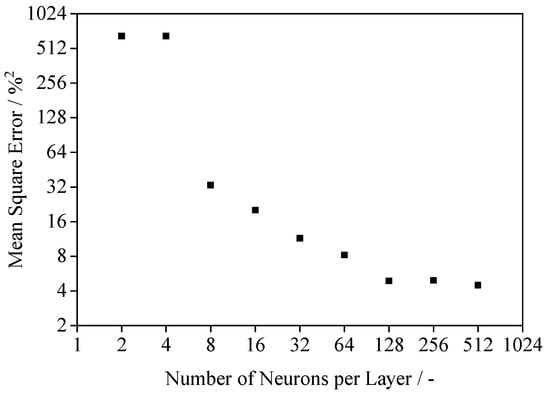 Subsequent optimization of the applied artificial neural network is based on varying the number of neurons of each layer within the block structure. In order to identify an optimum width of the network, the number of neurons is varied across a broad range from 2 to 512, corresponding to a power function of natural numbers to the base of 2. Other elements and structures of the applied neural network remain unchanged during the optimization step. The structural optimization is conducted by training the neural network for consecutive 10,000 epochs. A randomized 80:20 split for training and validation of the network, respectively, is applied to assess the generalization capabilities of the neural network in dependence on the underlying number of neurons.