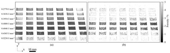 The resulting two-dimensional matrix of spatially resolved porosity values displays the influence of varying processing parameters on the formation of defects in the core region and in the edge region that significantly contribute to the porosity of a particular cross-section. In accordance with findings by Pavan et al. (2017) [6], the modeled spatial porosity distribution indicates a predominant influence of the variation of the applied energy density and the aging state of the used material, evident in Figure 12. Based on the validation process layout, a satisfactory accordance of predicted, part-specific porosity values and corresponding experimental values can be observed, displayed in Figure 13.
