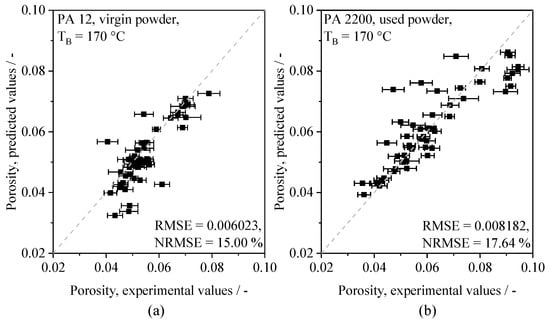Relation of experimental and predicted, part-specific porosity values for the use of virgin (a) and pre-aged (b) PA 12 powder, perfect fit indicated by dashed line.