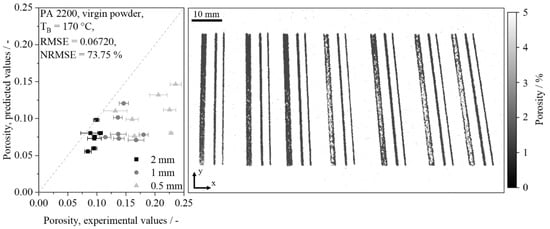 Considering the predominant accordance of experimental and predicted values, a generalization concerning varying physical material properties can be achieved. A further aspect of the generalization capability of the network concerns the influence of the chosen spatial resolution. Given the low range of underlying geometric shapes represented in the training data, the accordance with locally resolved values indicates the capability of the neural network to predict porosity values over a wide range of spatial resolutions. With regard to results presented by Zhang et al. (2017) [39], who demonstrated the ability of in-process image-based porosity quantification for the processing of metal alloys with a root mean square error (RMSE) of 1.32%, root mean square errors of 0.6023%, and 0.8182%, obtained for virgin and aged powder, are considered satisfactory. The validation of thin-walled samples concerns the demonstration of the capability of the network to generalize on geometries varying in a broad range. Considering the observed deviations between predicted and experimentally assessed values, a considerably increased prediction error is observed for the porosity prediction of thin-walled samples, displayed in Figure 14.