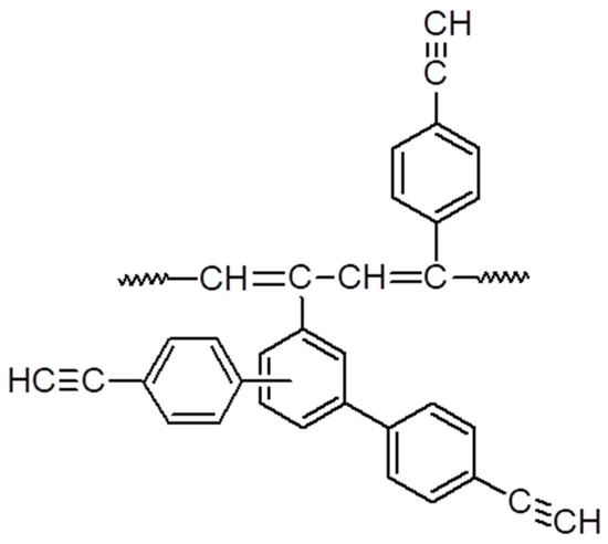 A large number of publications devoted to the synthesis and study of the physicochemical properties of substituted polyacetylenes and polydiacetylenes is explained by their unique properties such as thermo- and solvatochromism, optical characteristics, catalytic activity, and photoelectric sensitivity [1,2,3,4,5]. Homo- and copolymers of p-diethynylbenzene (DEB) as polyarylacetylene resins have additional properties that distinguish them in this class of polymers: good graphitization, high thermal resistance and increased coke residue, which is important when creating carbon-carbon composite materials for aviation and rocket engineering [6,7,8,9,10,11,12]. Using the DEB polymer, it was proposed to produce composites of carbon nanotubes [13] and quartz glass [14], Pt/C electrocatalysts with Pt nanoparticles in highly porous carbon spheres for fuel cells [15], humidity sensors [16], and micro-mesoporous meshes with increased adsorption capacity to hydrogen [17]. A wide variety of initiators are used for polyDEB synthesis, including quite rare and exotic ones [1,3,4,5]. In these cases, branched and/or cross-linked polymer chains are usually obtained, which may have not only vinyl links but also phenylene fragments.
