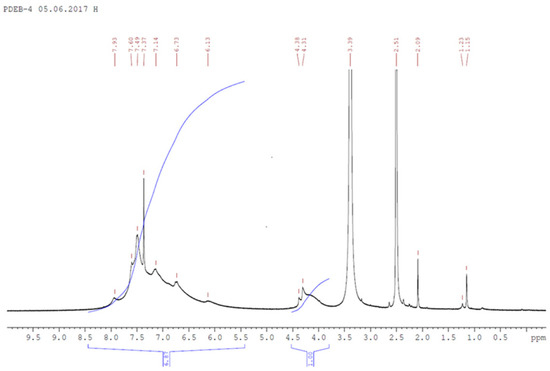 In the 1H NMR spectrum of a polymer obtained in an HMPA medium (Figure 3), the signals of protons of phenyl nuclei and protons with a double bond of the polymer chain are manifested by a complex, poorly resolved multiplet in the range δ = 6.2–8.3 ppm. The signals of ethynyl protons are observed as a widened singlet line at 3.6 ppm. The ratio of the sum of the integral intensities of the signals of aromatic and olefin protons to the integral intensity of the signal of protons of ethynyl groups, for polymers obtained in HMPA, is 5:1, which corresponds to the presence of one ethynyl group in the elementary unit of the macromolecule (if we assume a polyene structure in the polymer). Polymers obtained in DMSO have similar 1H NMR spectra; however, the ratio of the integral signal intensities of aromatic and olefin protons to ethynyl protons for them is 7:1. This can be explained by the partial disclosure of the second ethynyl group in DEB with the appearance of branching.