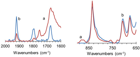To determine the type of substitution of benzene rings, IR spectra of 10% polymer and monomer solutions in the regions of 2000–1650 cm−1 and 900–650 cm−1 were measured. The peaks of the IR spectra of polymers have predominantly the same frequencies as the corresponding peaks in the monomer (Figure 5). The formation of micropeaks at 726, 760, and 880 cm−1 can be caused by both out-of-plane deformation vibrations of the polyene chain and partial trimerization of the monomer. The appearance of a peak at 1756 cm−1 in the region of compound frequencies and overtones (2000–1650 cm−1) may be caused by the presence of micro-quantities of 1,3,5-substituted phenylene fragments.
