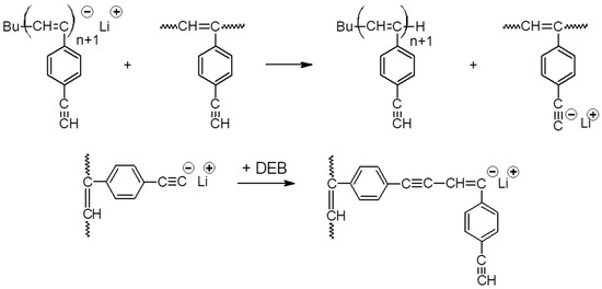 The course of DEB polymerization with selective disclosure of only one ethynyl bond and a decrease in the reactivity of the remaining unreacted ethynyl group in PDEBA compared to DEB can be explained as follows. One of the C≡CH groups in monomeric DEB is conjugated with a phenylethynyl substituent HC≡C–Ph–, which is a strong electron acceptor. Therefore, the –C≡CH group in the monomer polymerizes well in the presence of anionic initiators [1,30]. Since there is no conjugation in the polymer between the polyene chain and the substituent H–C≡C–Ph– [35], the free ethynyl group in the side substituent PDEB is conjugated only with the phenyl ring. This ring has weaker electron acceptor properties than the ethynylphenylene group of the initial monomer conjugated with another polymerizing ethynyl group. Consequently, the reactivity of the remaining ethynyl group in the PDEBA side substituent in the polymerization reaction will be less compared to the reactivity of the ethynyl group in the monomer.