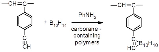 To the polyDEB or CPA solution in toluene, a toluene solution of decaborane (0.5 or 1 mol B10H14 per 1 mol –C≡CH) and 2 moles of N, N-dimethylaniline were added. The solution was stirred for 8 h at 90 °C until the release of H2 was completely stopped. The toluene solution was washed with hydrochloric acid, distilled water and planted in a tenfold excess of hexane.