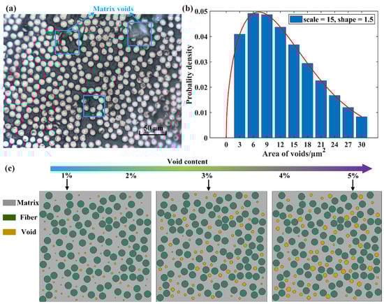 The presence of void defects has deleterious effects on the service performance of composites. Several manufacturing parameters including molding pressure, curing temperature and resin viscosity can induce the formation of void defects in the matrix, as shown in Figure 1a. In composites, voids are found in different volume fractions, shapes and sizes. In this study, the main purpose is to reveal the effect of voids content on the water absorption behavior and mechanical performances. Thus, the void generation algorithm fulfil the following terms: (1) voids only exist in the matrix, and voids are approximately circular in shape; (2) the void distribution is random, the positions of voids are automatically generated using the random sequential adsorption (RSA)-based algorithm programmed in MATLAB (2018a) [26,27]; (3) as shown in Figure 1b, void size distribution is in accordance with the Weibull distribution, and the values of scale and shape are 15 and 1.5, respectively; (4) there is no intersection between voids and fibers, and void contents of 0%, 1%, 2%, 3%, 4% and 5% are considered in this work, as shown in Figure 1c.