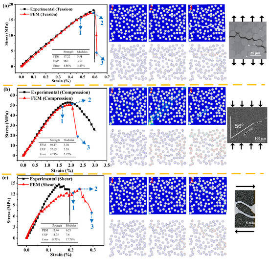 The stress–strain curves of the RVE model without voids under the transverse tension, transverse compression and transverse shear are shown in Table 2. The blue images in the first row are the equivalent plastic strain (PEEQ) nephogram of the whole RVE model, which indicates the plastic deformation under the three loading modes. The white images in the second row are the stiffness degradation (SDEG) nephogram of cohesive elements, which indicates the damage revolution of the interface during the different load process. The three columns of the images are corresponding to the onset of interface failure (“1”), the peak load (”2”) and the end of loading (”3”), respectively. The mechanical performances, including strength and modulus determined by FEM, are also compared with the experimental data to verify the accuracy of numerical simulation.