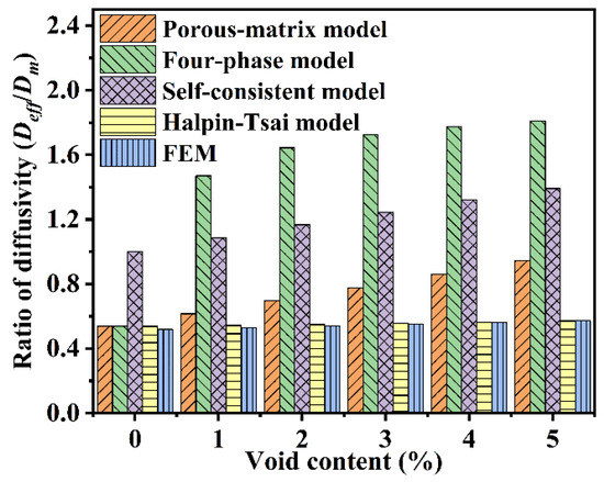 As shown in Figure 3, determined by the Halpin–Tsai model based on Equation (5) agree well with FEM results. Therefore, the Halpin–Tsai model is accurate and effective, which can rapidly predict the transverse diffusivity of composite with different volume fractions of voids.