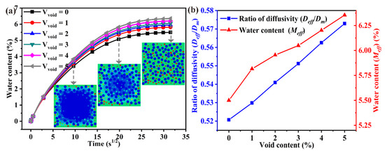 Effect of void content on the water absorption performance, (a) water content, (b) ratio of diffusivity.