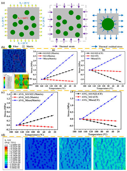 As shown in Figure 5a, in the preparation of CF/PA6 laminates by the molding process, the CF/PA6 prepreg is heated to a processing temperature, and subsequently solidified upon cooling from 160 °C to the ambient temperature (about 25 °C). The mismatch in the coefficients of thermal expansion (CET) between the CFs (−0.83 × 10−6/°C) and the PA6 matrix (4 × 10−6/°C) results in a significant difference in deformation behaviors. Figure 5d describes the changing revolution of residual stress for the matrix and the fiber with the temperature, in the curing process. Through the stress nephogram and the corresponding legend, under the deformation coordination constraint, tensile stress arises in the PA6 matrix, and compressive stress occurs in the CFs. Stress components (S11/S22, S12, Mises stress) increase linearly with the decreasing temperature for the reference points in the CFs and matrix (Figure 5b). In contrast, the average value of stress components for the CFs and matrix is shown in Figure 5c. The average stresses for the CFs and matrix are relatively small after the temperature cooling to 25 °C, with average Mises stress of 1.70 MPa and 1.44 MPa, respectively, which indicates the thermal residual stress is not the main reason for the mechanical damage.