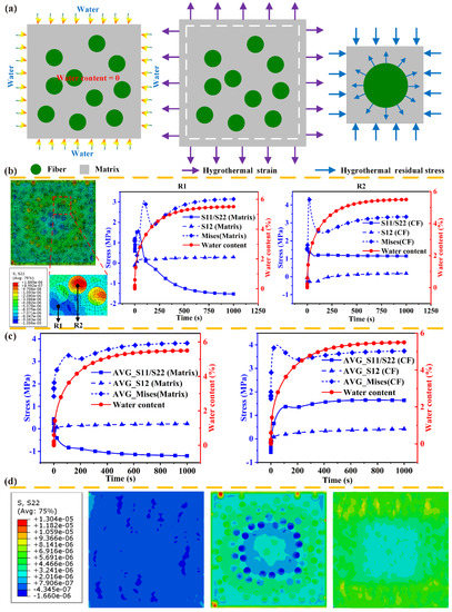 As shown in Figure 6a, and after CF/PA6 composites’ immersion in the distilled water, the volume of the PA6 matrix expands, while the CFs are not affected by the water. Figure 6d describes the changing revolution of residual stress for the matrix and the fiber with the temperature under the hygrothermal environment. Through the stress nephogram and the corresponding legend, under the deformation constraint, compressive stress arises in the PA6 matrix and tensile stress occurs in the CFs. Figure 6b shows the evolution of stress components for the reference points in the CFs and matrix in the water absorption process. The magnitude of residual stress depends on two factors: water content difference and moisture expansion coefficients. The PA6 matrix exhibits tensile stress before hygrothermal aging, and it is the thermal residual stress in the manufacturing process. In the initial water absorption process, the tensile stress increases from 0.58 MPa to 1.65 MPa. It is explained as follows: the reference point is located in the middle area of the RVE model, and the water diffusion front has not arrived. Tensile stress arises in the middle area due to the water content difference between the internal and external area, resulting in an increase in the stress value. As the water diffuses into the middle area and the water content increases, compressive stress occurs in this area, which can reduce the value of the tensile stress and change the stress from the tension (1.65 MPa) to compression (−1.52 MPa). On the contrary, the tension stress arises in the CFs and the stress value increases from −0.46 MPa to 1.15 MPa, though a small fluctuation occurs in the initial process. The average value of stress components for the CFs and matrix in the water absorption is shown in Figure 6c. The shear stress (S12) is almost unchanged, but the normal stress (S22) of the matrix decreases from 0.43 MPa to −1.19 MPa and that of CFs increases from −0.56 MPa to 1.63 MPa. It is worth noting that the transverse tensile strength of CF/PA6 composites is about 9.5 MPa. Compared with the thermal residual stress, the hygrothermal residual stress is closer to the interfacial strength, which can promote initiation and propagation of cracks in the matrix and interfacial debonding.