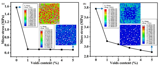 Effect of voids content on the residual stress, (a) Mises stress of cooling contraction, (b) Mises stress of hygroscopic expansion.