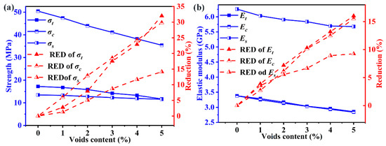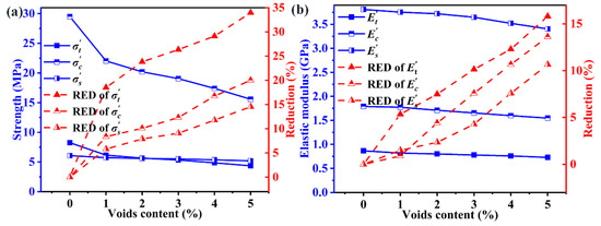 There is a distinct inflection point in the evolution of strength as shown Figure 9. When voids content is less than 1%, the reduction rate is significantly higher than from 1% to 5%. With the voids content ranging from 1% to 5%, every 1% increase in the void content results in a 3.86%, 2.91% and 2.19% decrease in , and respectively. These reductions for the models after hygrothermal aging are lower than those of corresponding unaged models, and the failure mechanism is different. For unaged models, the voids content is the main reason for the mechanical degradation. In contrast, the voids and the water content combined determine the mechanical degradation after the hygrothermal aging. However, the contribution of voids content and water content to the reduction of mechanical performances are different. The decrease in the tensile strength induced by voids content (32.0%) is lower than that of water content (63%), and the negative effects of voids content are diminished. However, the variation trend of modulus is consistent with that of unaged models. After hygrothermal aging, every 1% increase in voids content results in a 3.16%, 2.73% and 2.13% decrease in , and respectively.