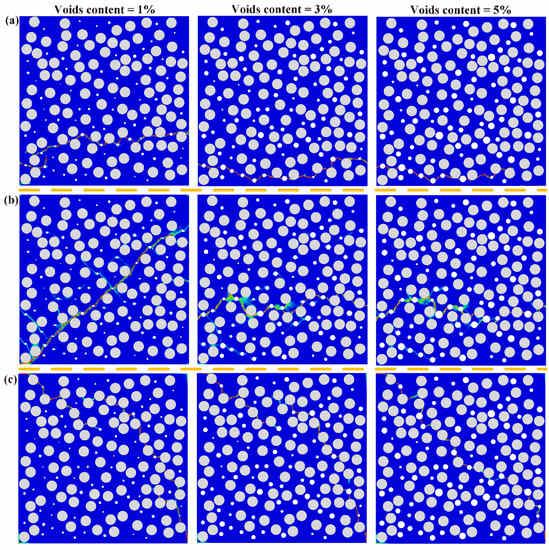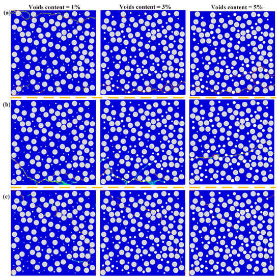 Figure 10 shows the final damage of RVE models with three different voids content under the transverse tension, compression and shear. It is noted that RVE models have different final damage paths with different voids content. Voids significantly change the stress distribution and cause stress concentration of RVE models. The initial damage is induced around voids and the interface simultaneously, leading to the matrix damage and interfacial debonding, respectively. Then, the cracks propagate to neighbor areas to jointly create the final damage crack.