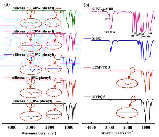 Figure 2. FT-IR spectra of (a) silicone oils with different phenyl content, (b) SHSO-g-MBB, SHSO, LCMVPQ 5 and MVPQ 5.